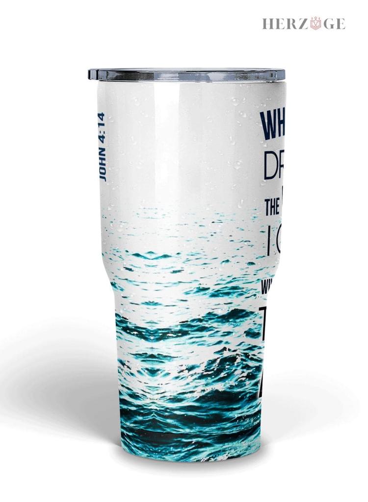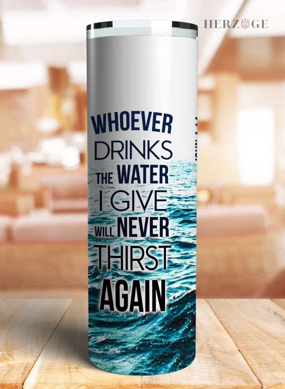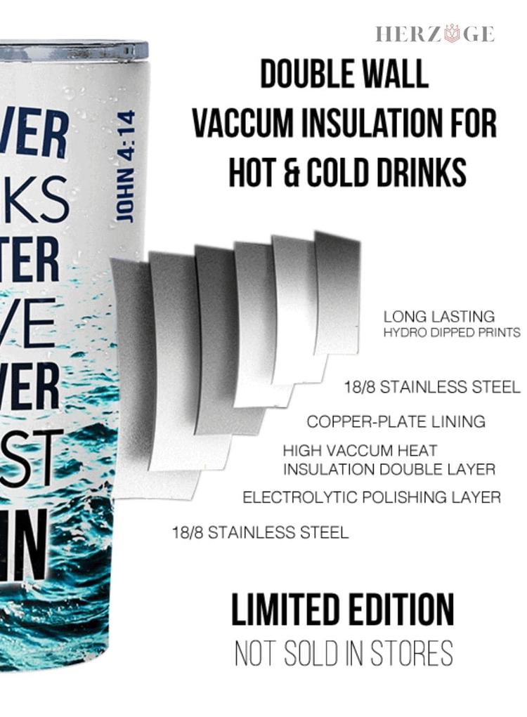 The inscription of John 4:14 on this tumbler brings spiritual comfort while keeping your beverages at the perfect temperature.