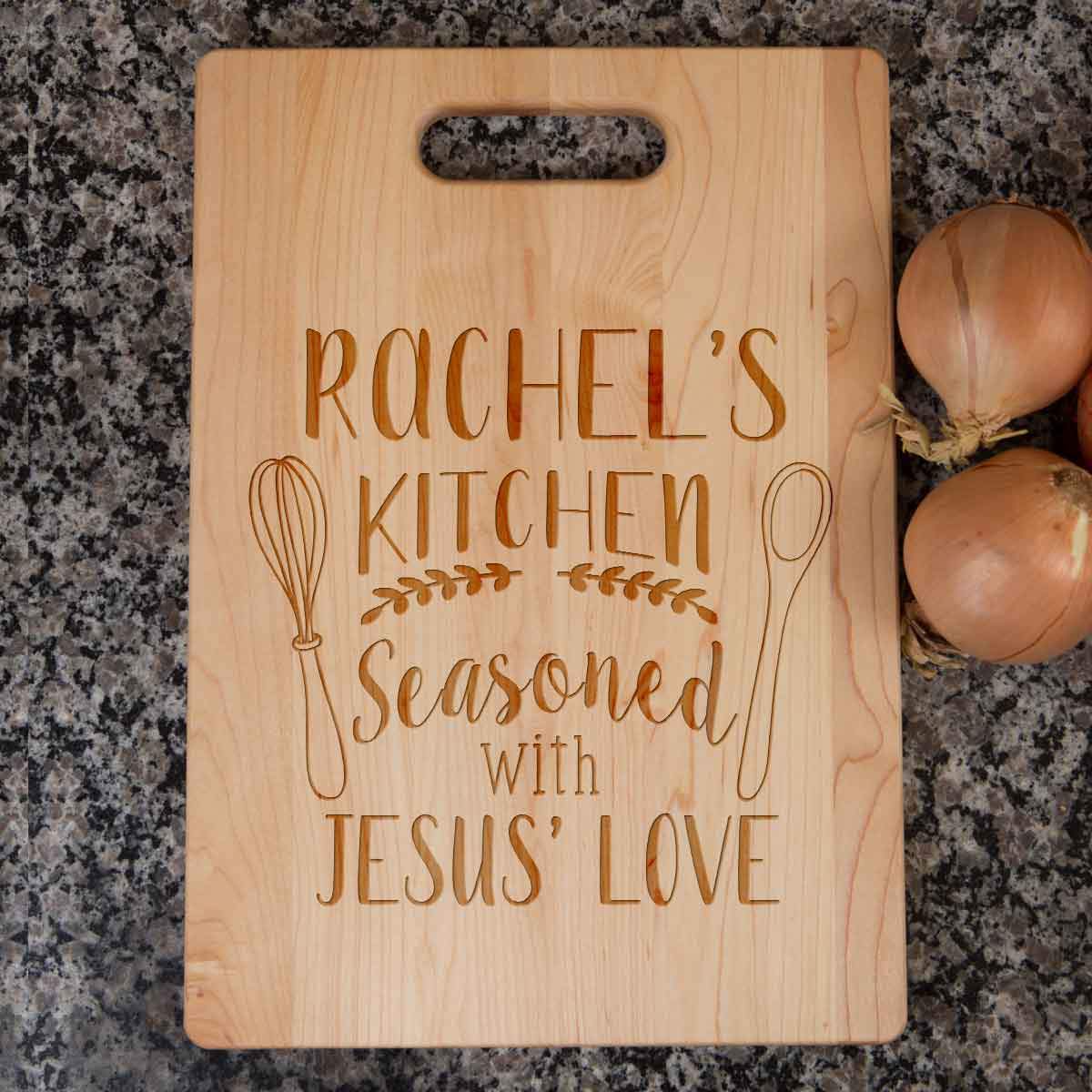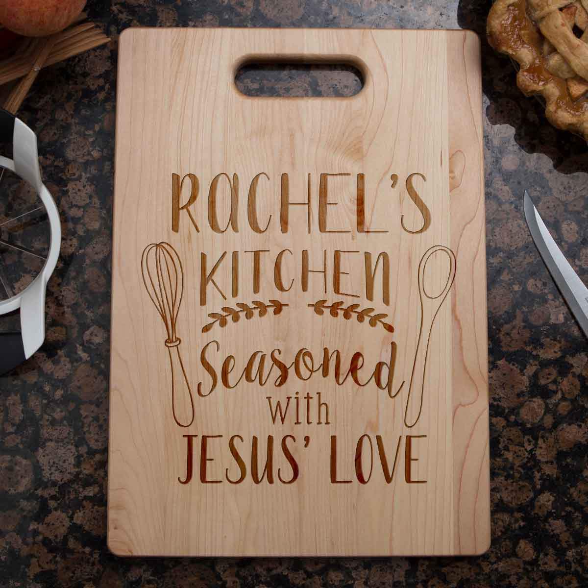 Embrace the sentiment with the statement “Name’s Kitchen. Seasoned with Jesus’ Love,” a declaration of faith and nourishment. Available in three sizes to suit your cooking needs, these cutting boards are made in the USA with a commitment to craftsmanship and quality.