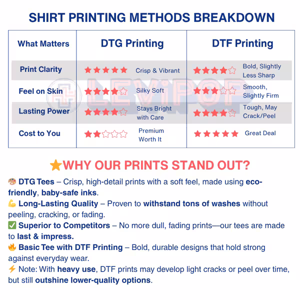 🎨 Premium Printing – DTG (Direct-to-Garment) printing on all shirts, except the Basic Cotton Tee, which uses DTF (Direct-to-Film) for durability.