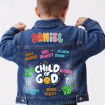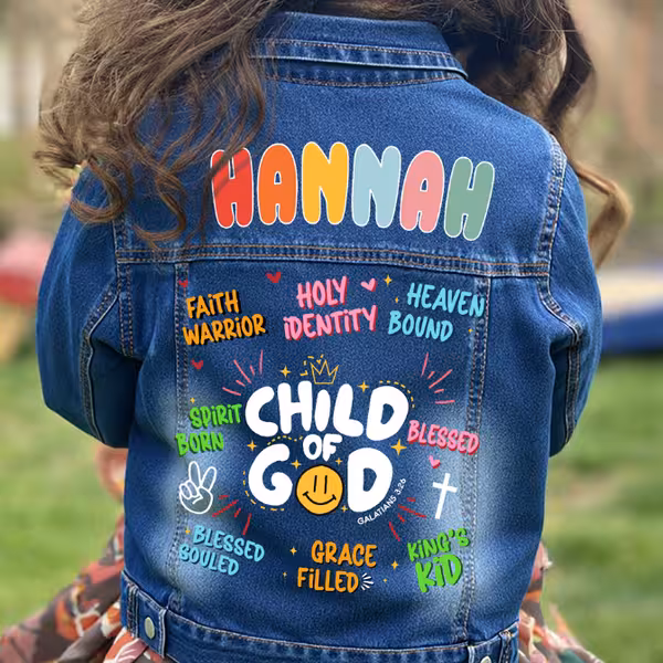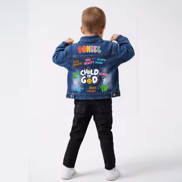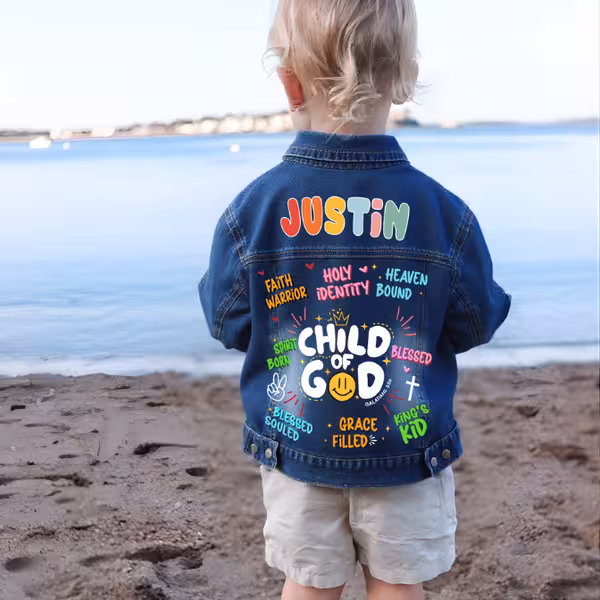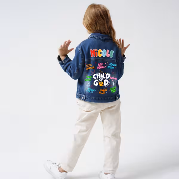 Celebrate your little one’s faith and joy with our Personalized “Child of God” Kids Jean Jacket — beautifully customized with their name and faith-filled design. This adorable, high-quality jean jacket is perfect for everyday wear, Sunday school, or gifting to the special little believer in your life.