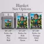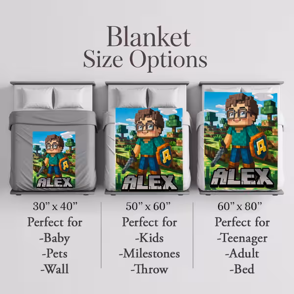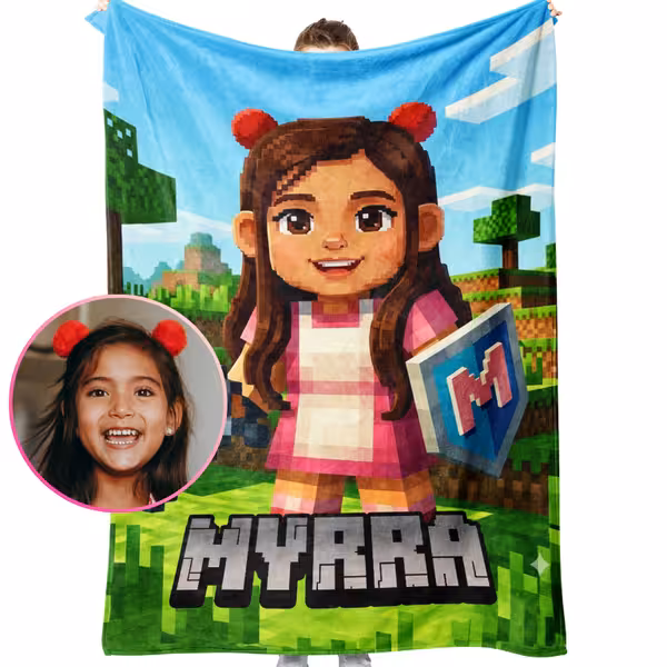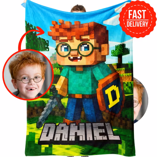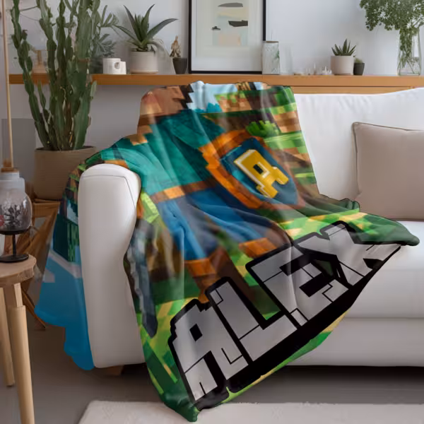 Imagine your little gamer’s excitement when they unwrap a blanket featuring themselves as a Minecraft-style character — complete with their name in blocky pixel letters!