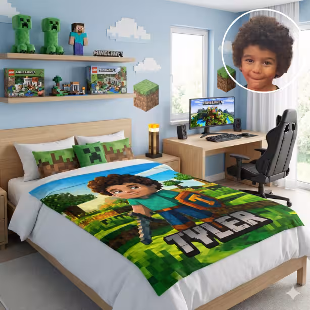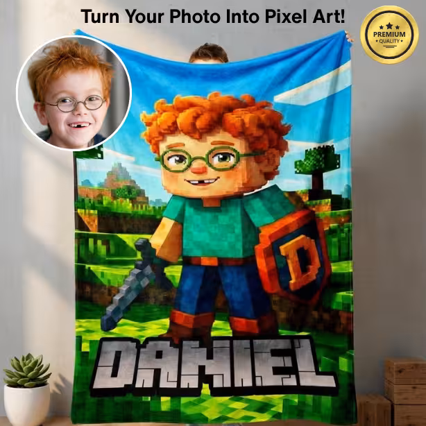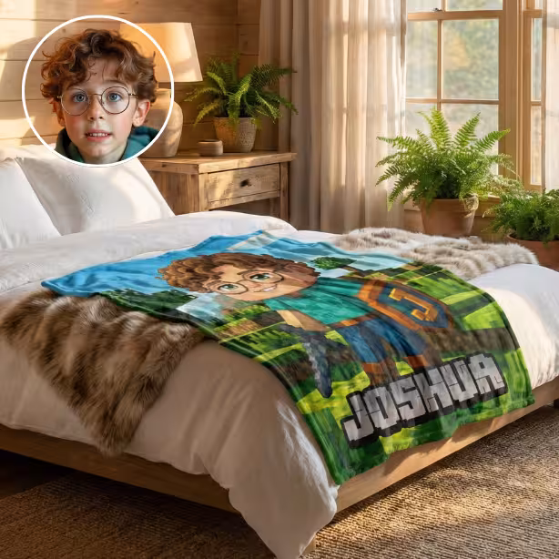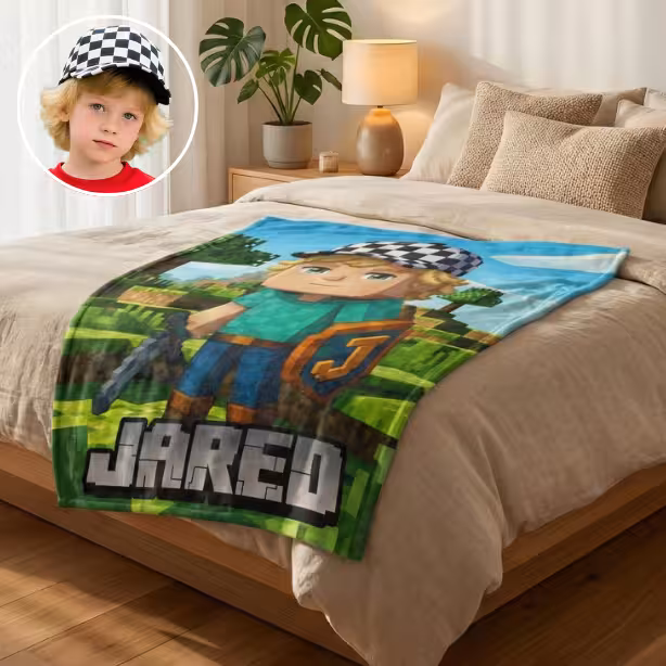 Imagine your little gamer’s excitement when they unwrap a blanket featuring themselves as a Minecraft-style character — complete with their name in blocky pixel letters!