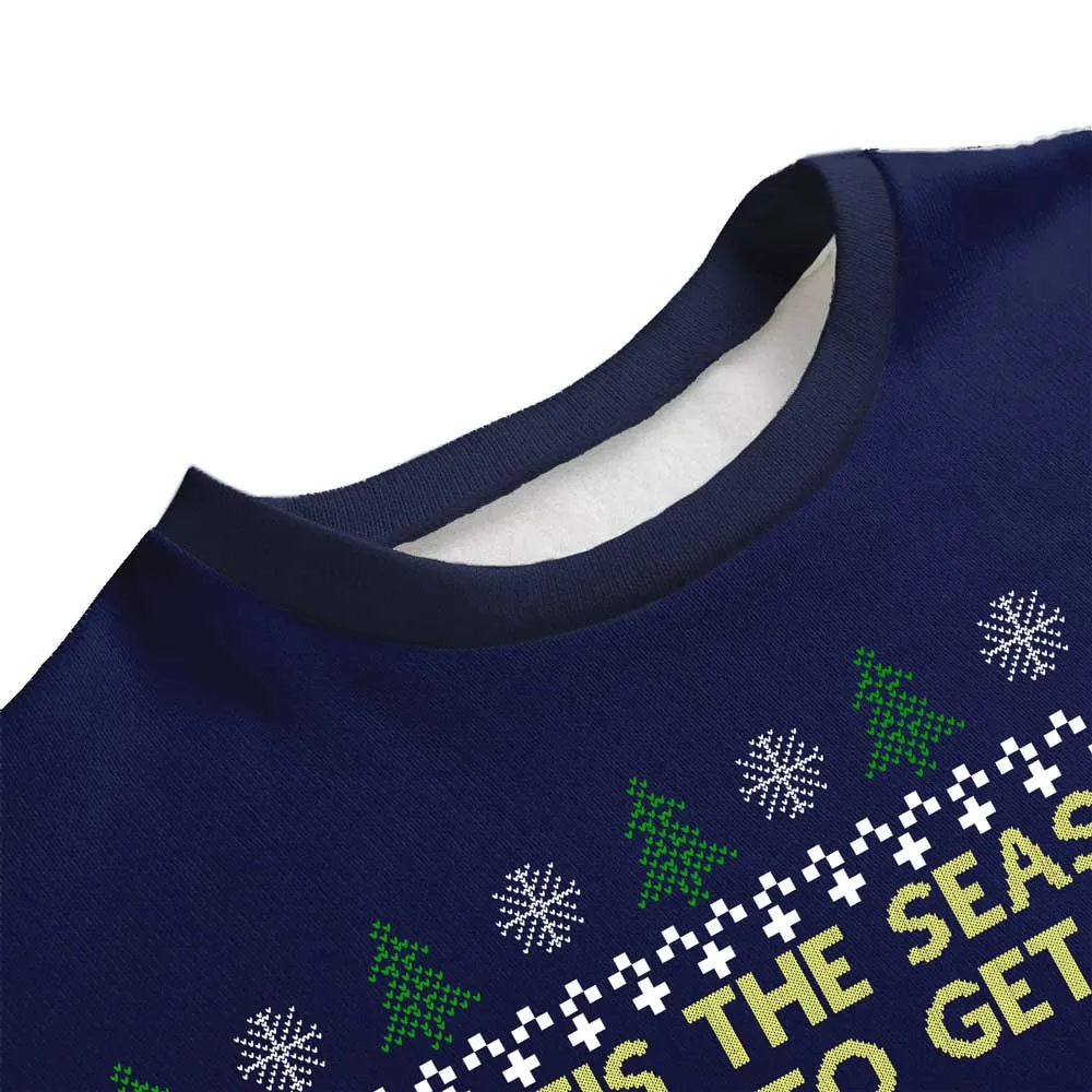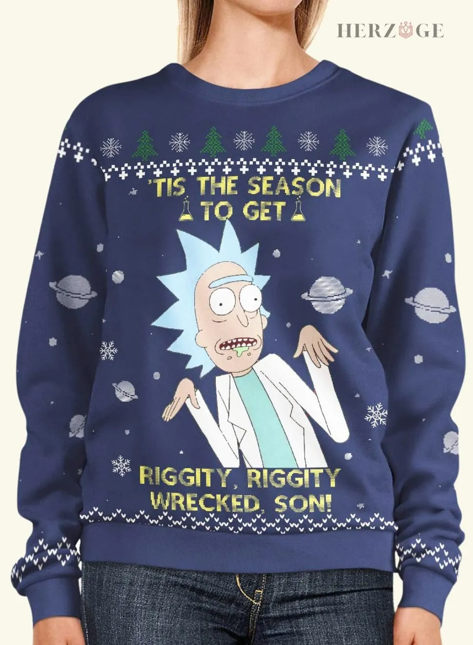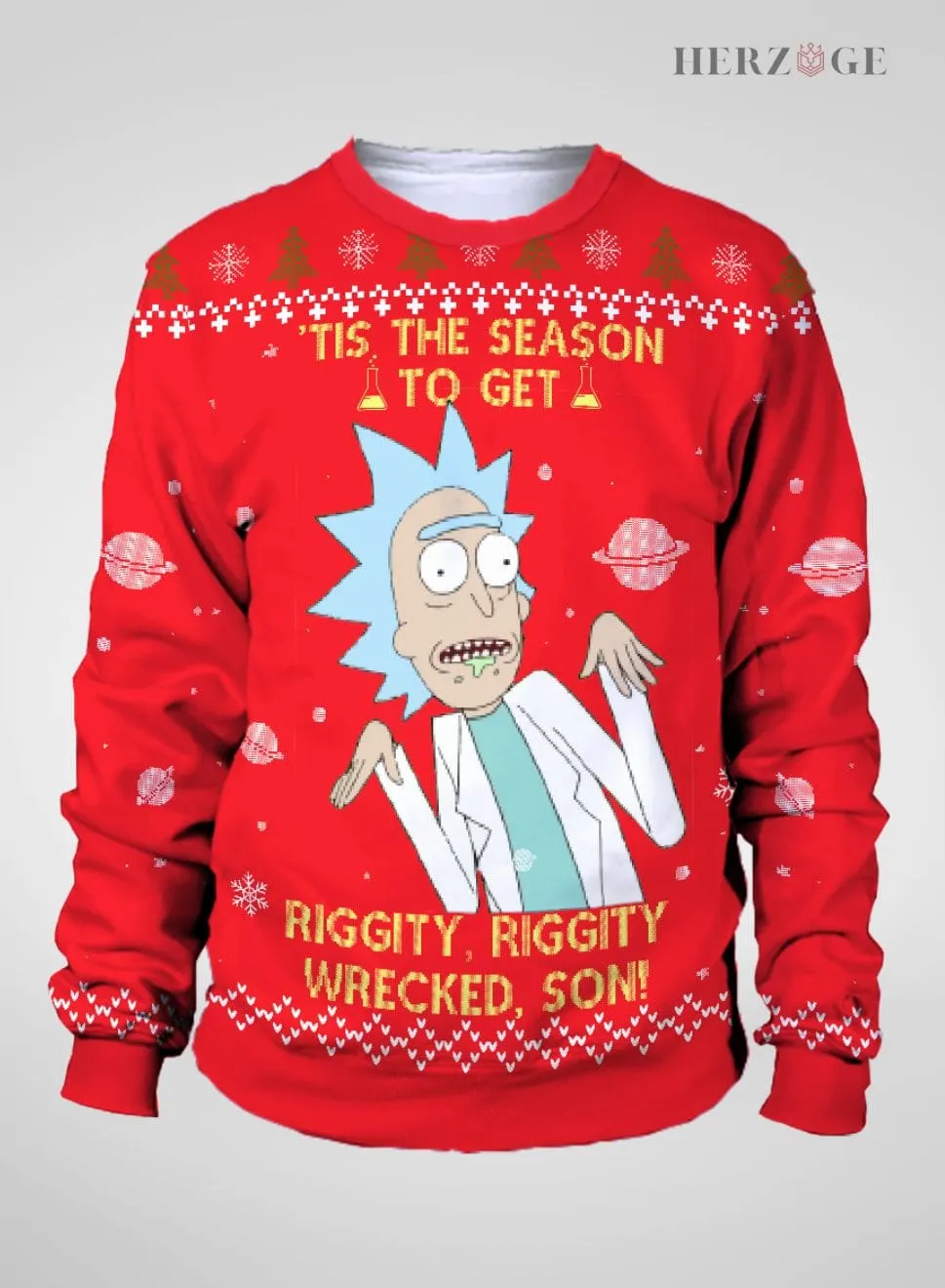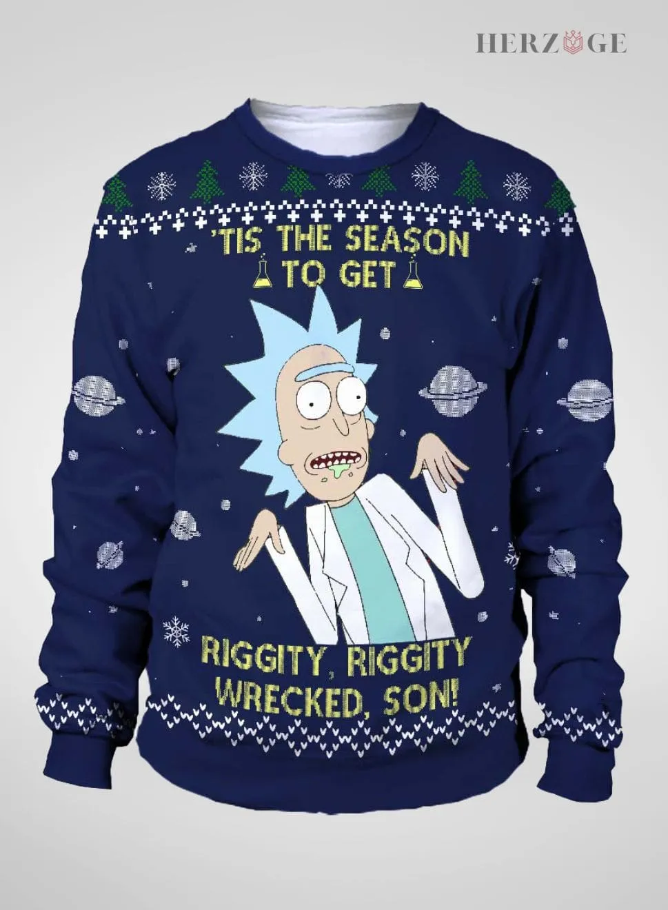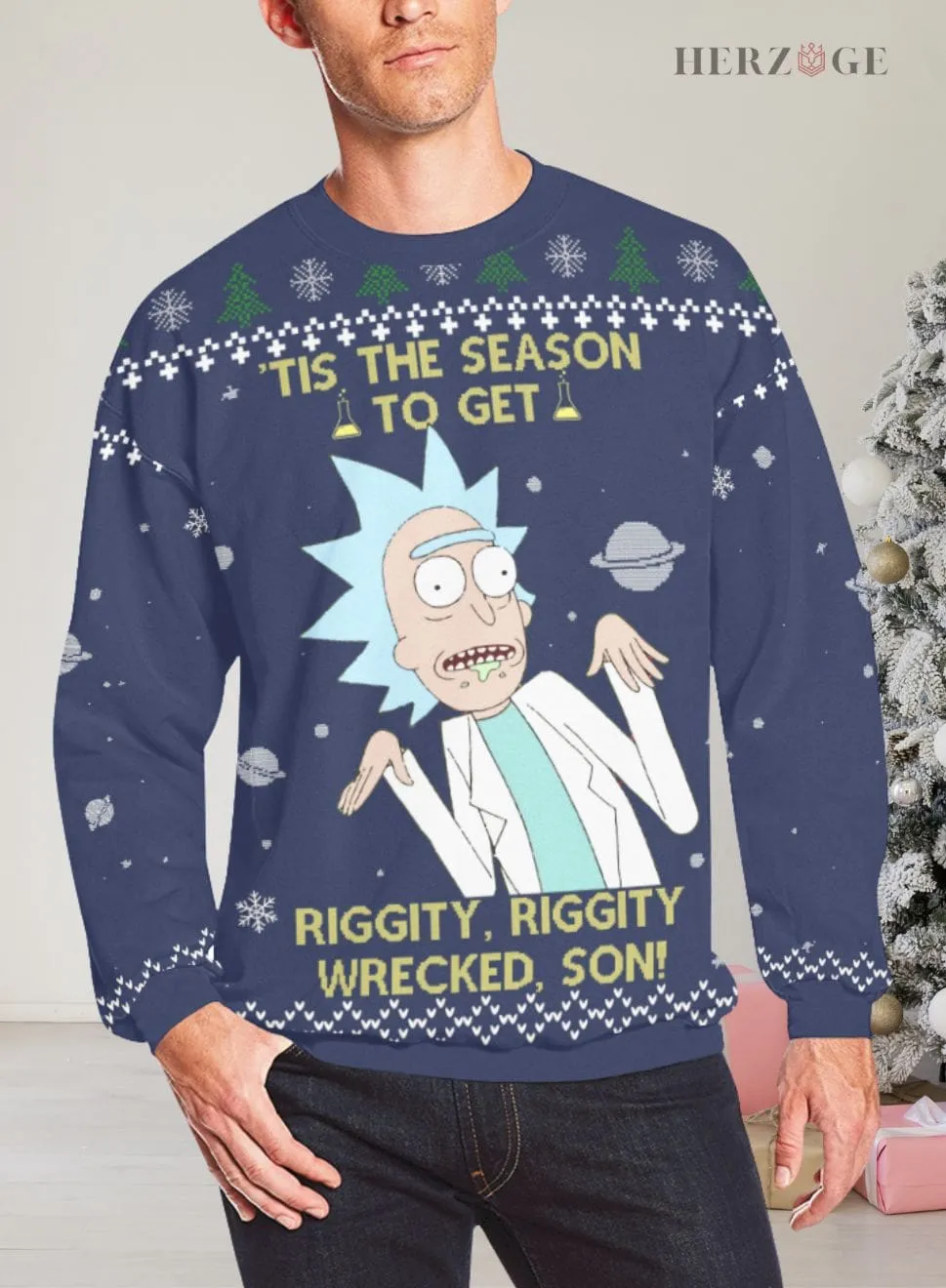 Designed with a regular fit and drop shoulders, our Rick and Morty Christmas Sweater offers a casual and relaxed look. The statement “Tis the season to get Riggity, Riggity wrecked son” is sure to turn heads and start conversations at your holiday gatherings.