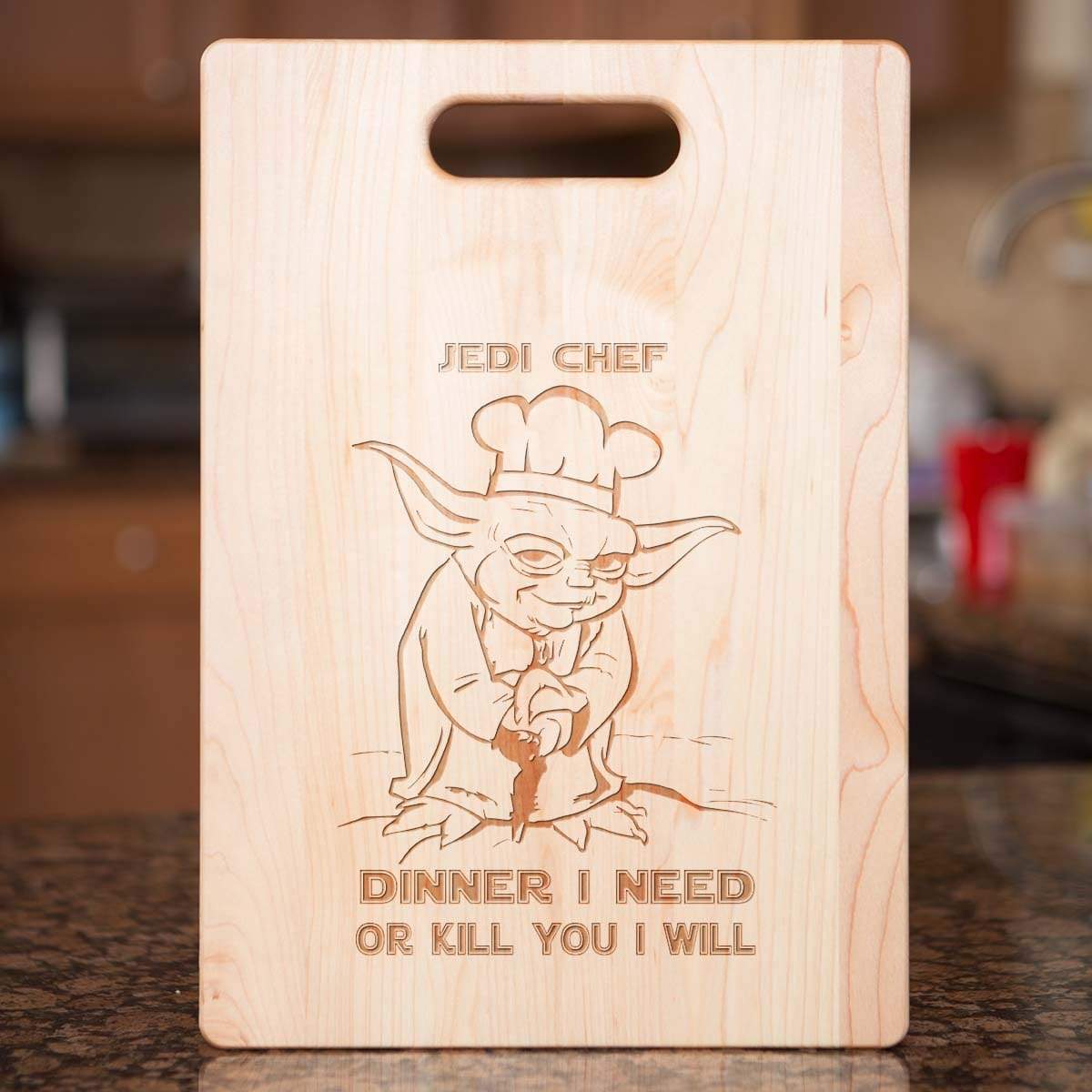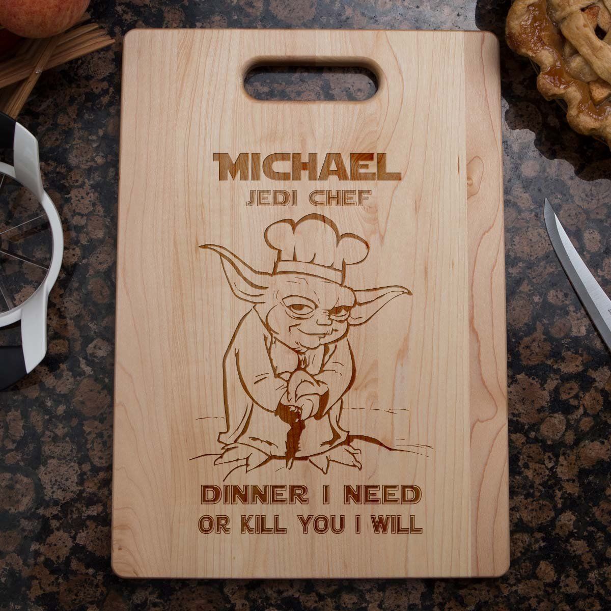 Designed to infuse personalization and pop culture, each cutting board proudly displays the iconic phrase: “Family Name” Jedi Chef, Dinner I Need or Kill You I Will. This customizable statement lets your family name shine, making your cooking space truly your own.